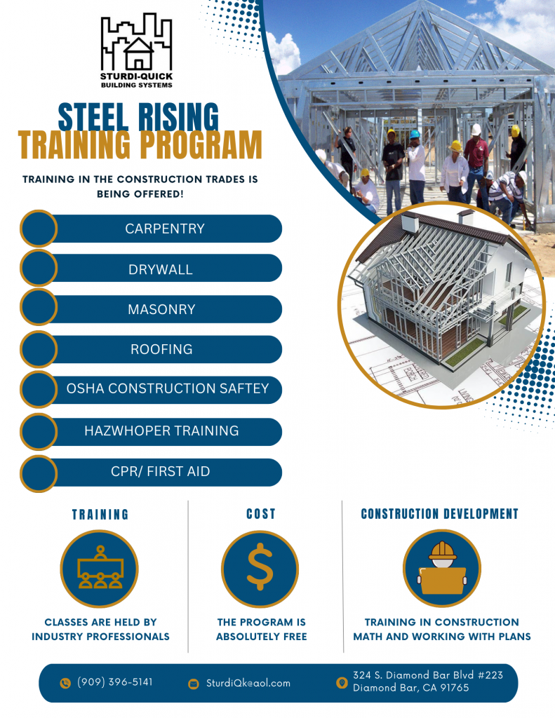 Sturdi-Quick Building Systems is a member to the California Steel Framing Alliance and has generated funding through the California Employment Training Program, to train and develop a workforce for the Residential Building and the Steel Building Industry.